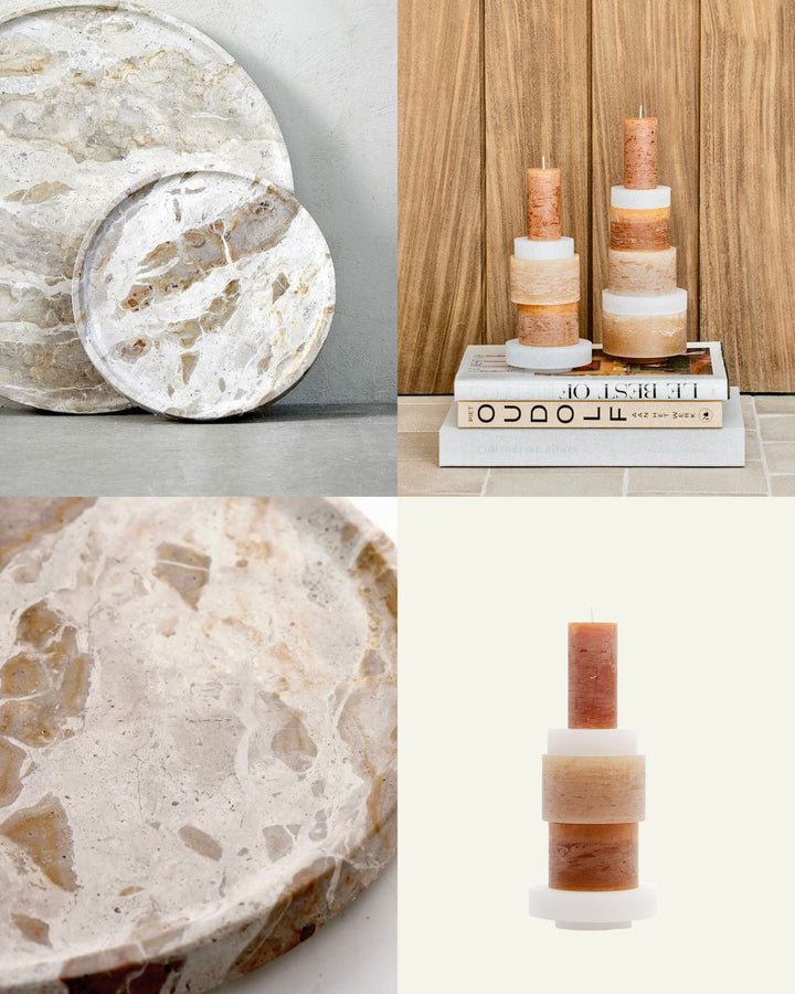 Een stijlvolle cadeau set met het Ellia marmeren dienblad van Lene Bjerre en Design Candle Stack van het Belgisch merk Stan Editions.