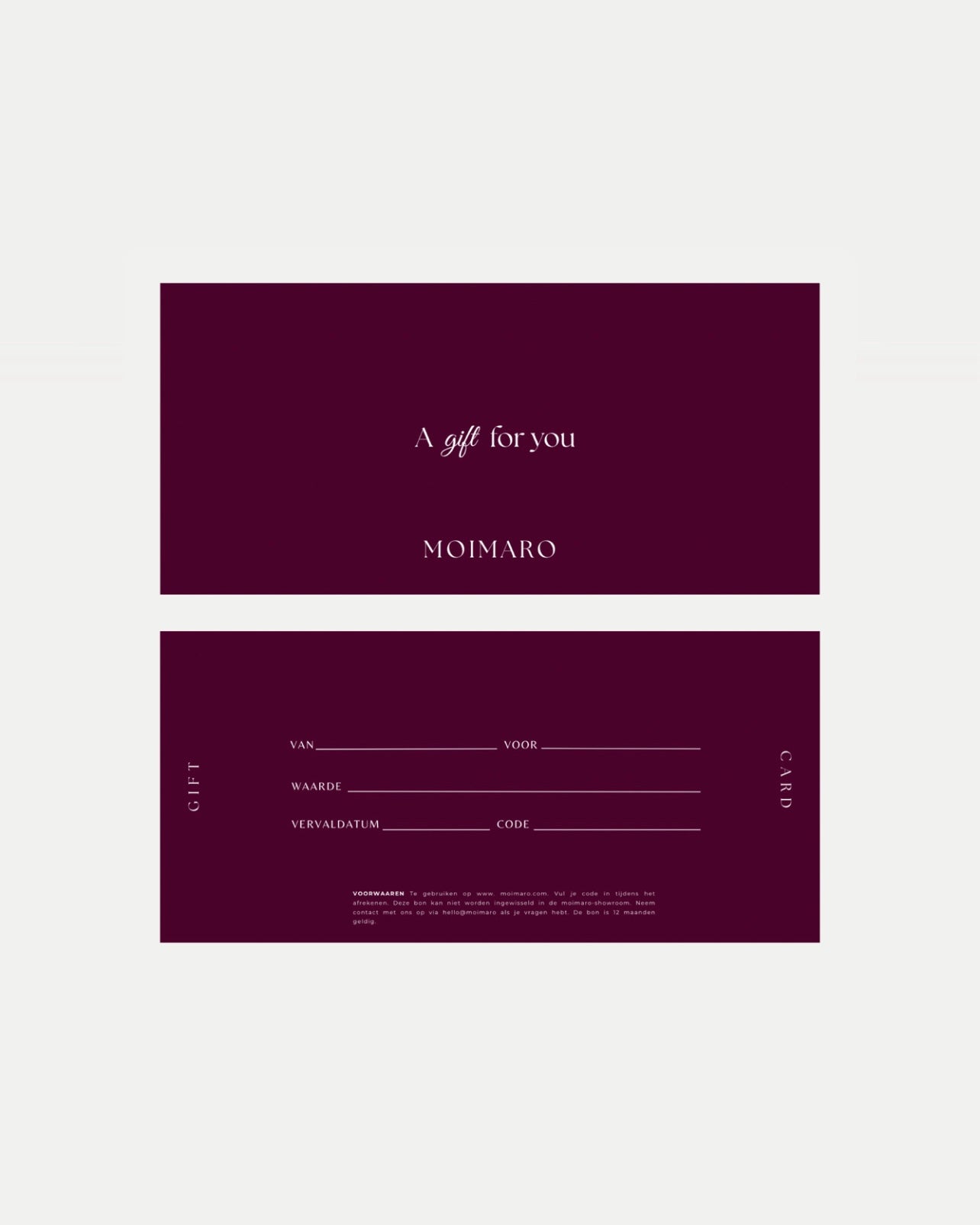 Met een MOIMARO cadeaubon geef je iemand iets om naar uit te kijken. De vrijheid om rond te neuzen in onze webshop, ideeën op te doen en uiteindelijk iets te kiezen dat echt bij hen past.