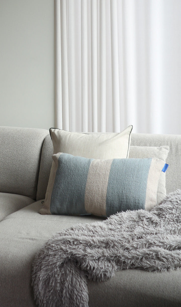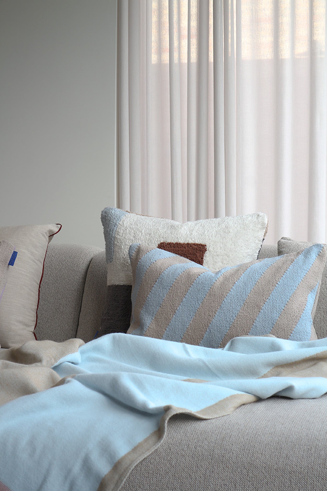 Aan de ene kant versieren diagonale strepen in licht blauw en zand de kussenhoes, terwijl de andere kant brede strepen in donkerder blauw en zand toont, op een eigentijdse manier geïnterpreteerd. Gemaakt van een dikke kilim-weving die textuur en extra zachtheid aan de stof toevoegt.