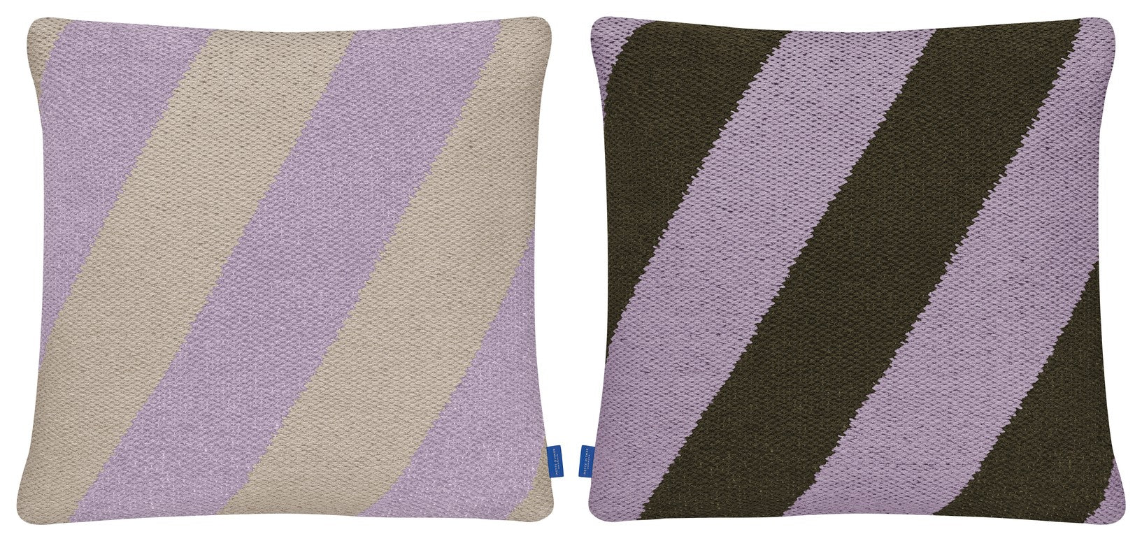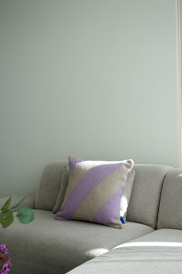 Aan de ene kant versieren diagonale strepen in lichtlila en zand de kussenhoes, terwijl de andere kant brede strepen in donker groen en zand toont, op een eigentijdse manier geïnterpreteerd. Gemaakt van een dikke kilim-weving die textuur en extra zachtheid aan de stof toevoegt.