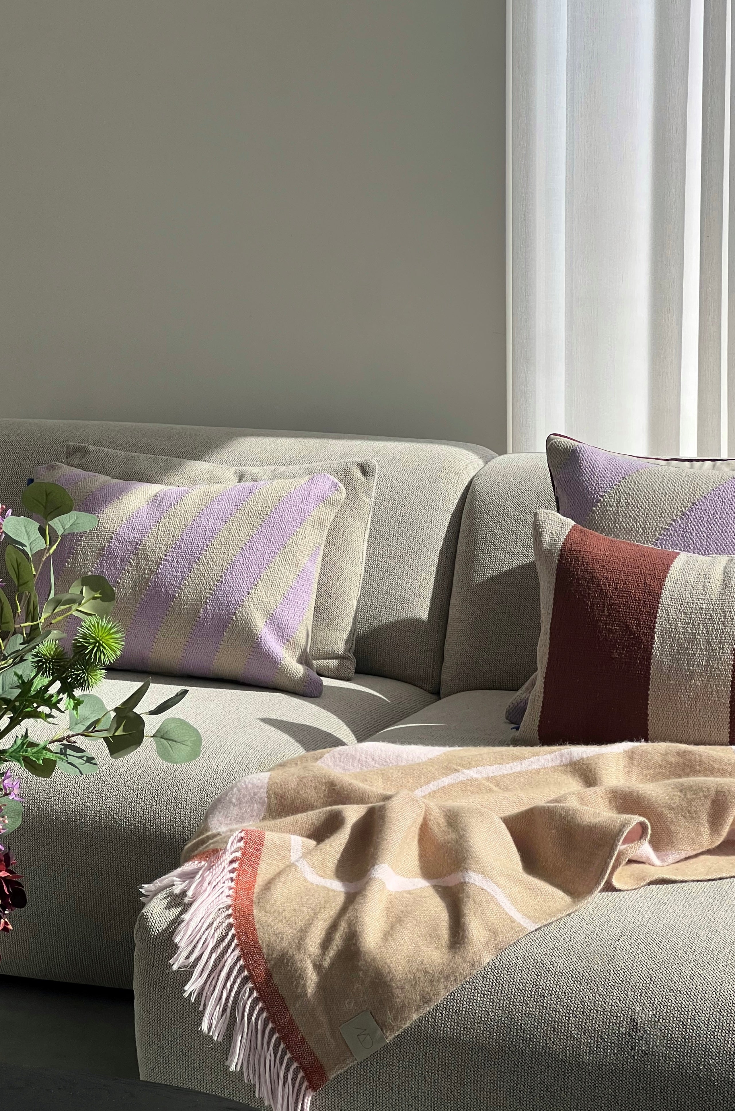 De ene zijde toont diagonale strepen in lichtlila en zand, de andere brede strepen in cognac en zand. De dikke kilim-weving zorgt voor extra textuur en een zachte uitstraling.