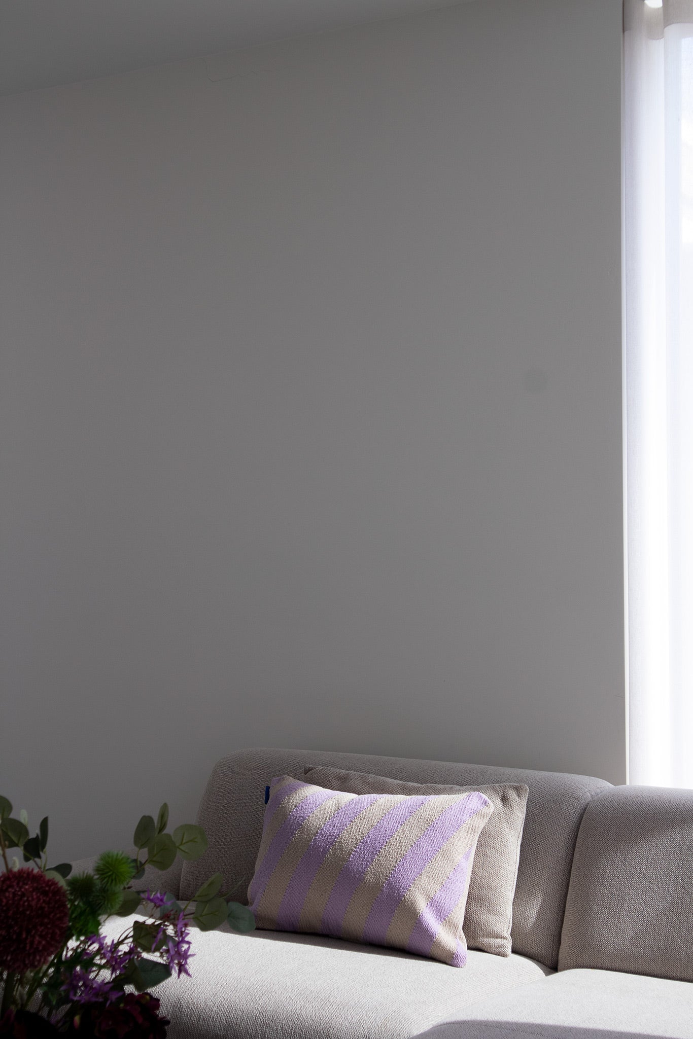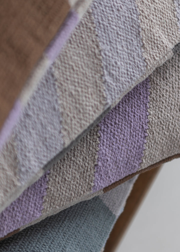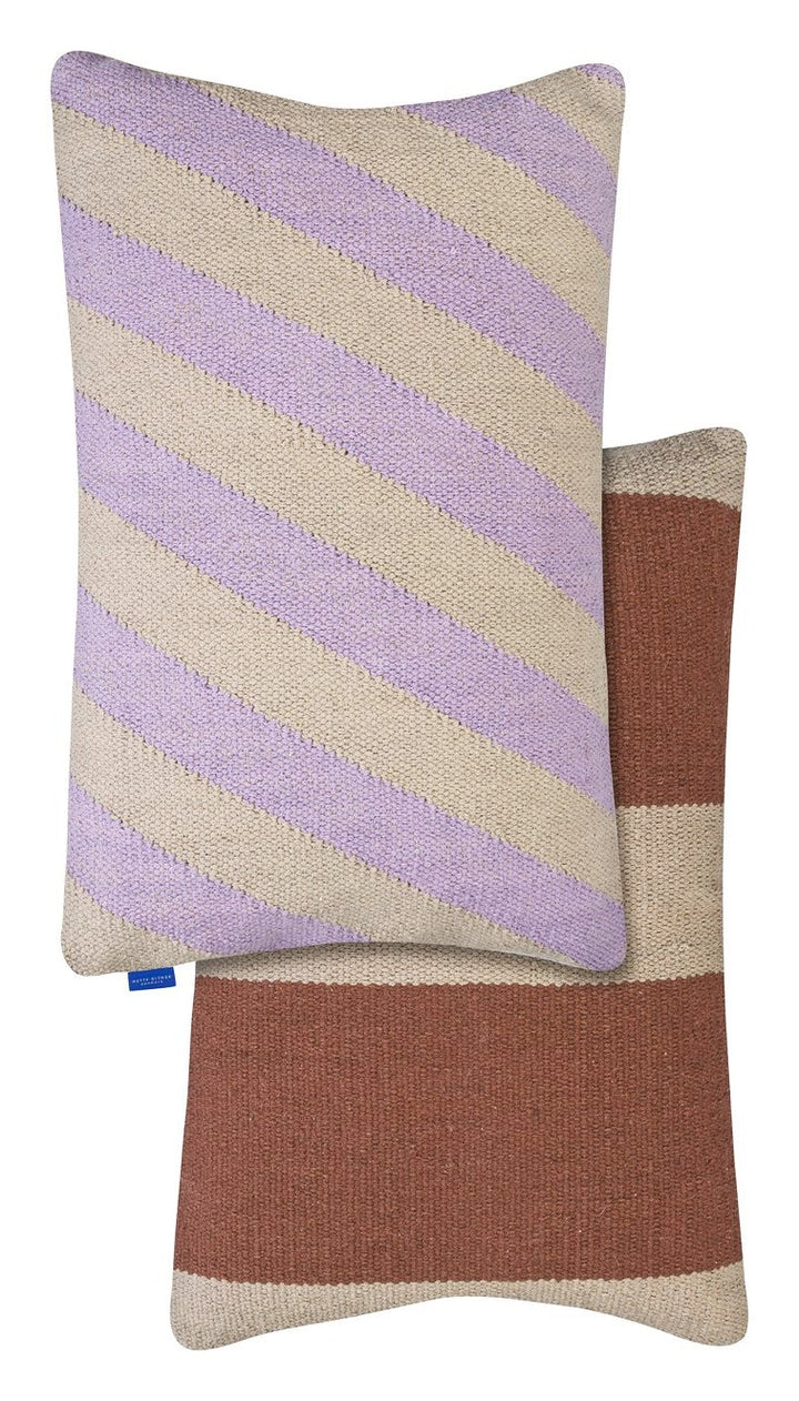 Aan de ene kant versieren diagonale strepen in lichtlila en zand de kussenhoes, terwijl de andere kant brede strepen in cognac en zand toont, op een eigentijdse manier geïnterpreteerd. Gemaakt van een dikke kilim-weving die textuur en extra zachtheid aan de stof toevoegt.