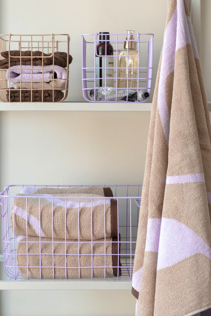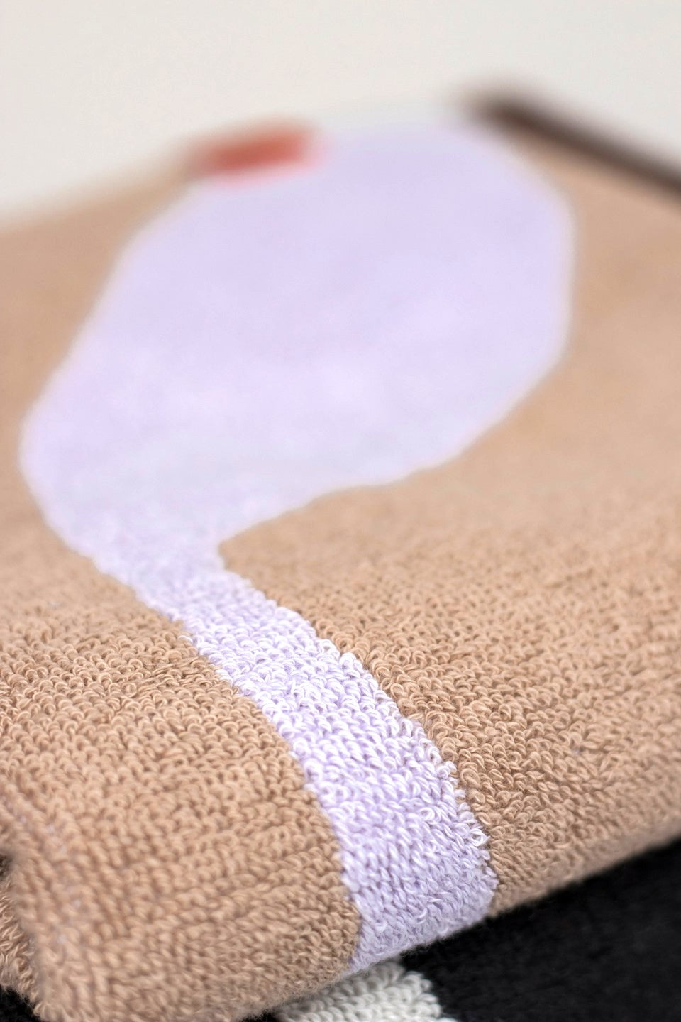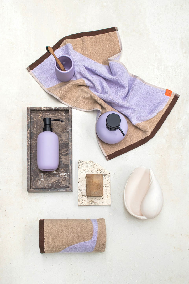 NOVA ARTE  betekent ‘nieuwe kunst’ en dat zie je terug in het abstracte, artistieke ontwerp van deze tweedelige gasthanddoeken set van het Deens merk Mette Ditmer. Grafische vormen en penseelstreken in sand en zwart worden subtiel afgewerkt met een lila rand, wat zorgt voor een verfijnde maar expressieve uitstraling in badkamer.