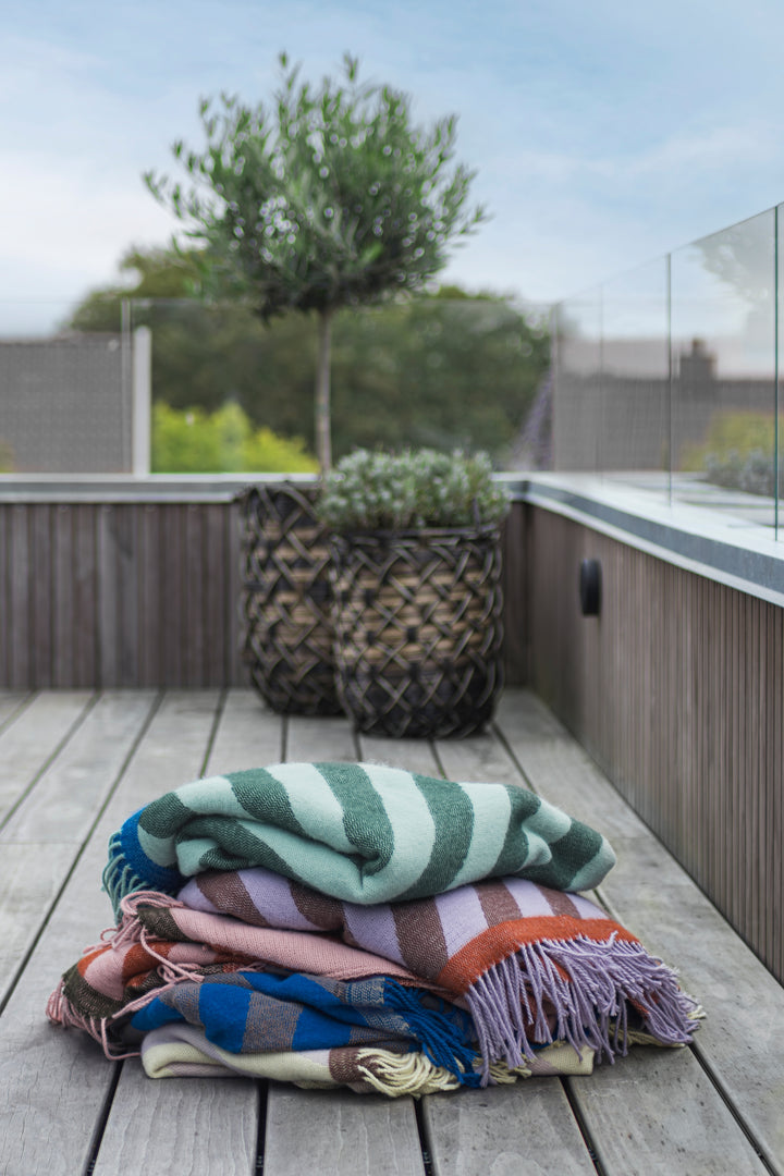 Wikkel jezelf in de Studio plaid van het Deens merk Mette Ditmer. Het diagonale patroon geeft een speelse, grafische touch en brengt meteen warmte en kleur in huis.