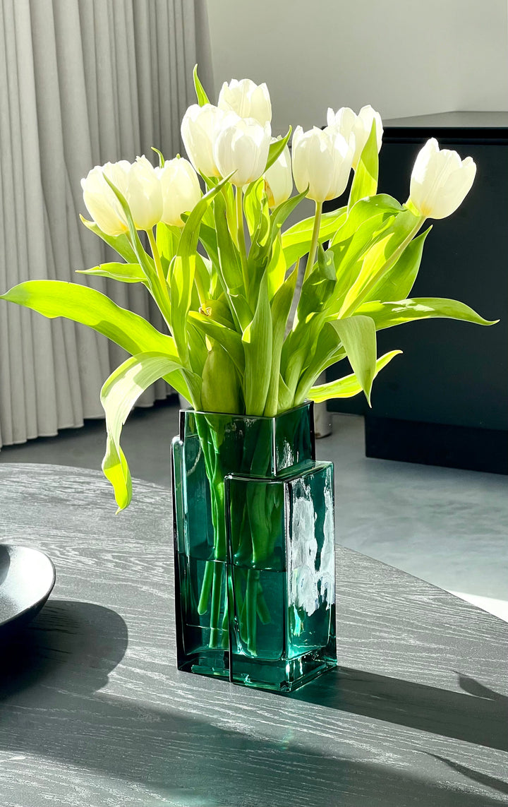 De modern groene kleur en het transparante glas zorgen voor een stijlvol en tijdloos effect. Gebruik de vaas als opvallend solostuk of vul haar met je favoriete bloemen voor een elegant accent. Ideaal als attent cadeau met een design touch.